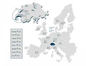 Located in the centre of Europe, Lausanne and Montreux are easily accessible, less than 3 hours by plane from the main European cities. Just 40 minutes from Geneva International Airport and 2.5 hours from Zurich Airport, the region offers easy access and a unique setting.
